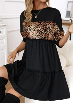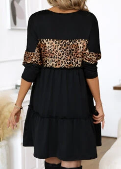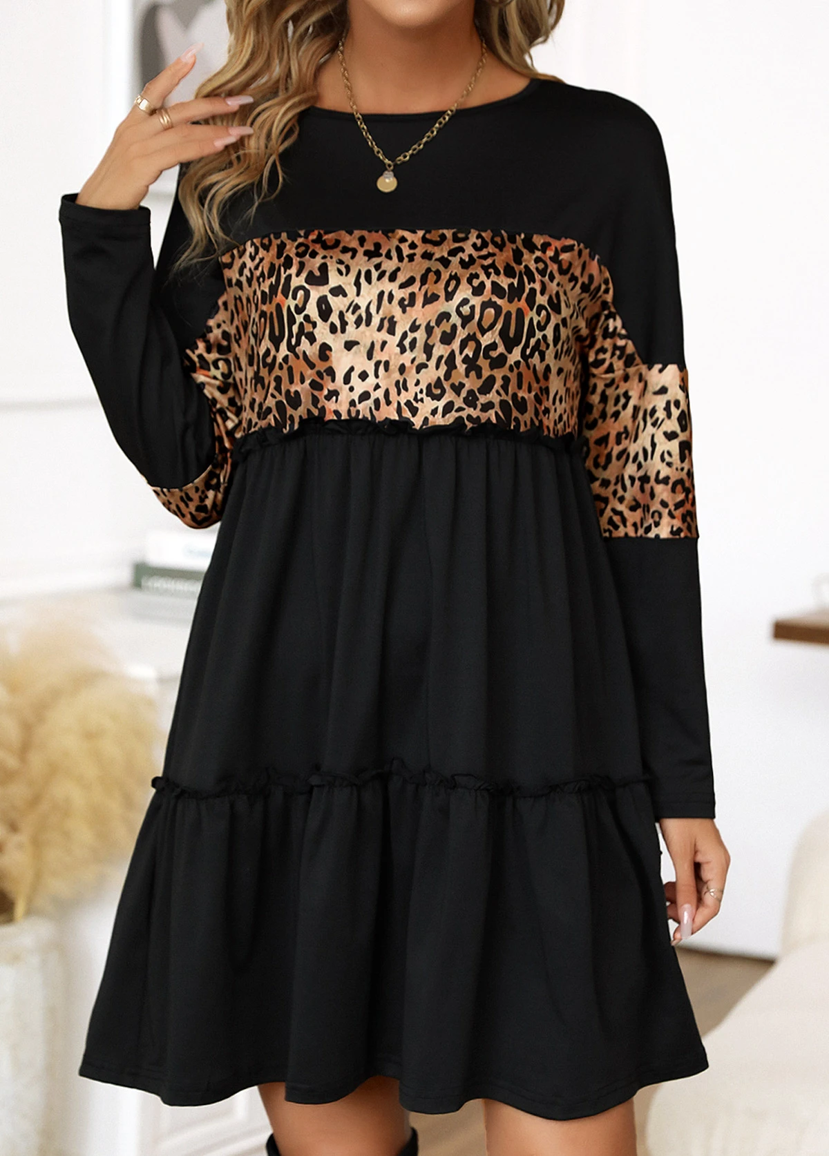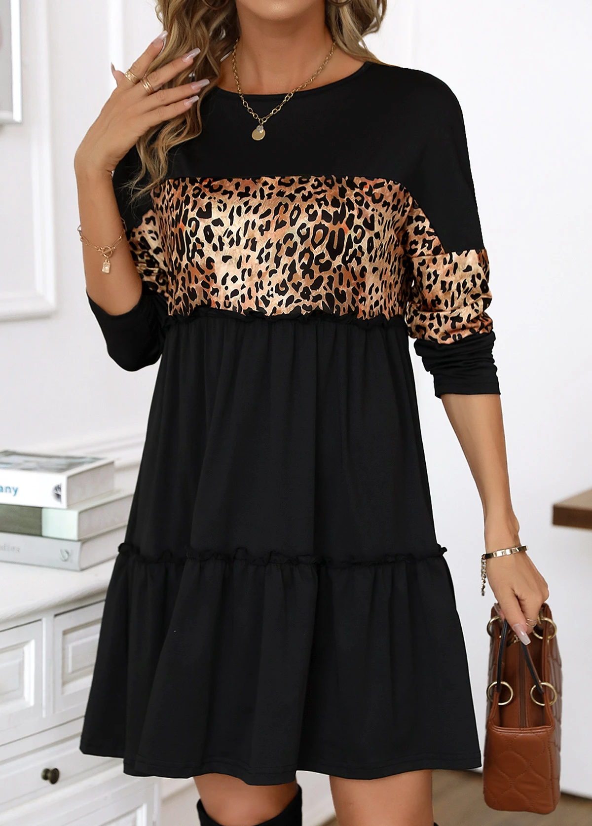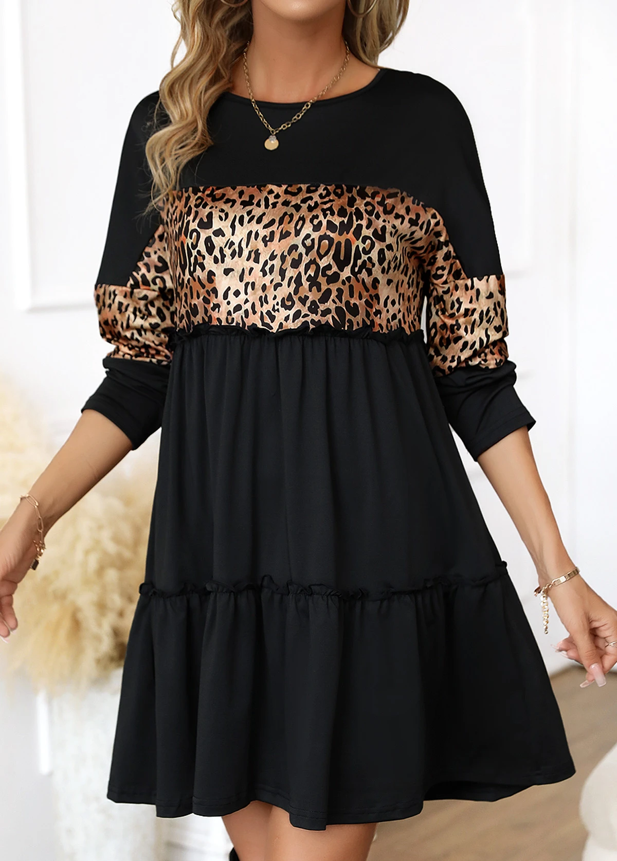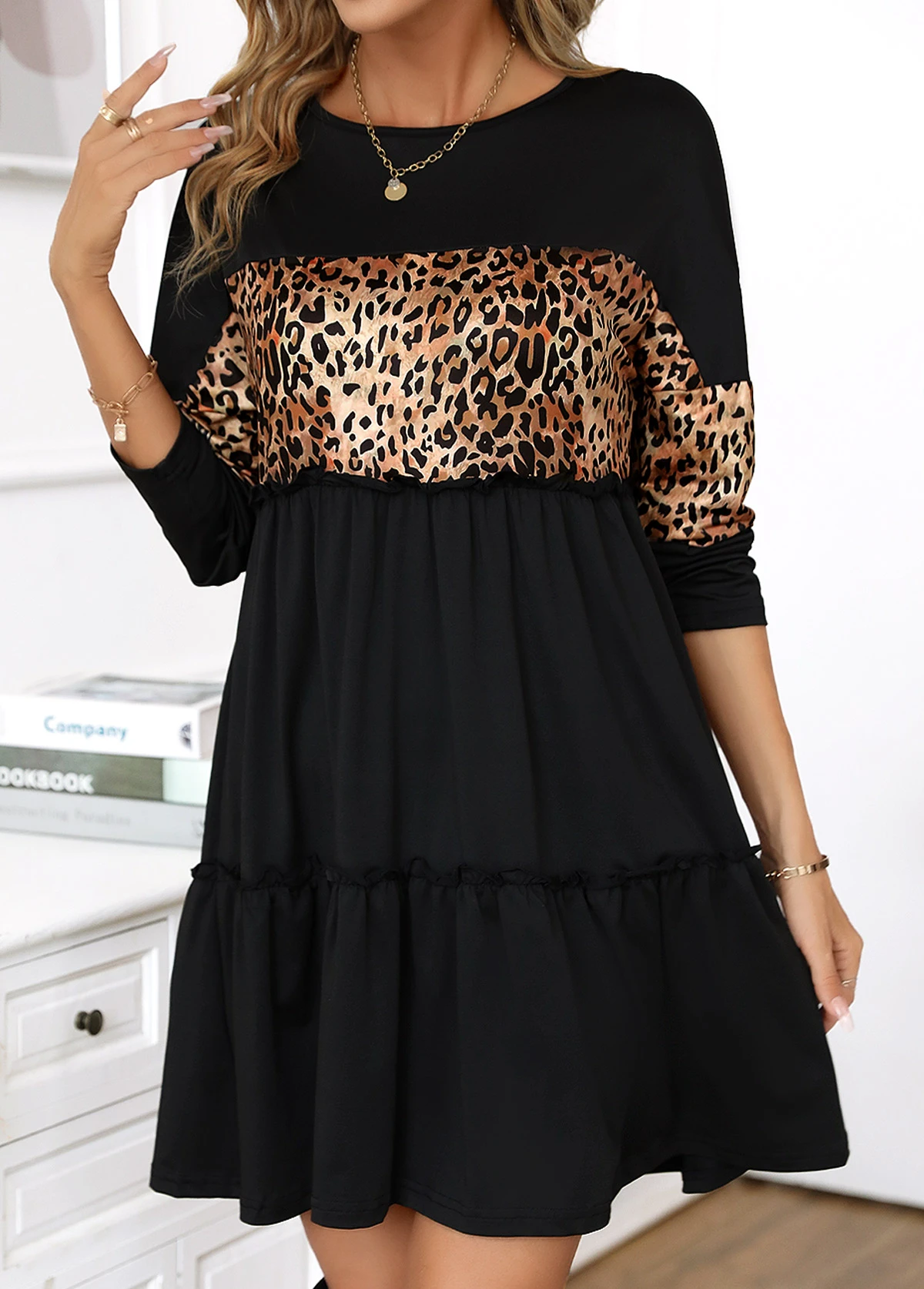Black Patchwork Leopard Short Long Sleeve Shift Dress