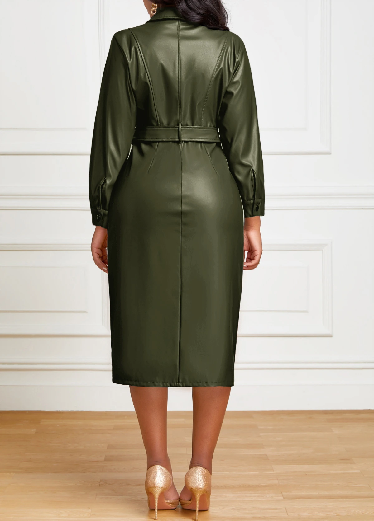 Blackish Green Belted Long Sleeve Bodycon Dress