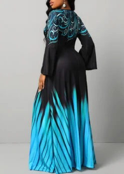 Blue Breathable Tribal Print Long Sleeve Maxi Dress
