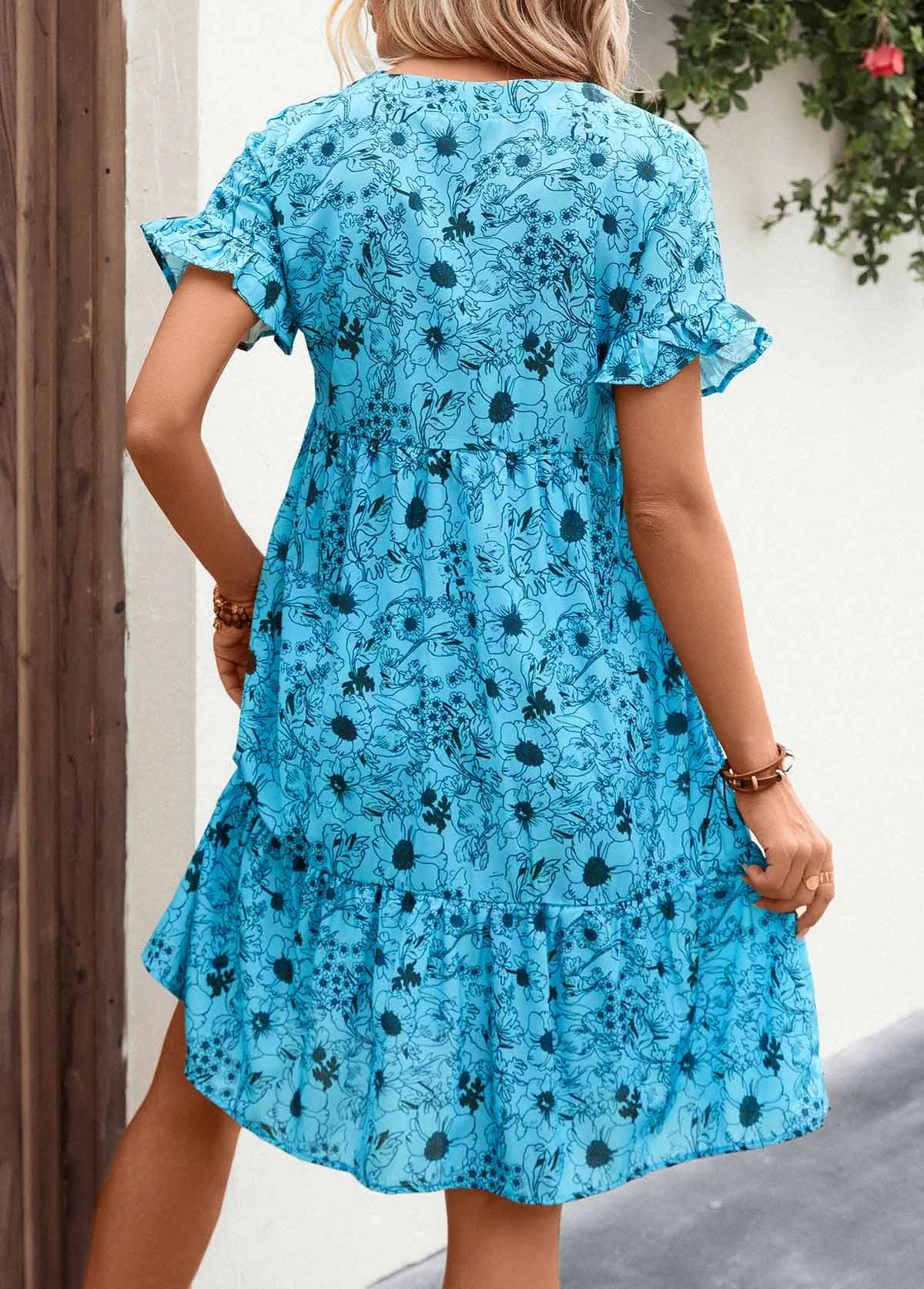 Button Detail Neon Blue Frill Floral Print Dress