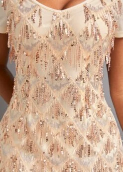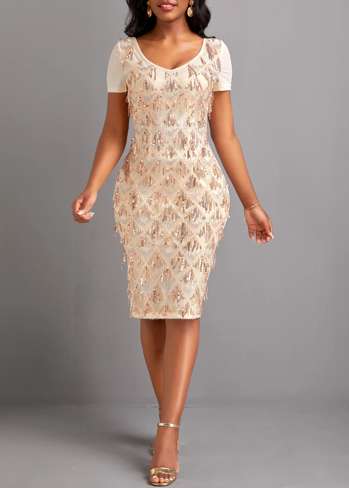 Champagne Sequin Short Sleeve V Neck Bodycon Dress