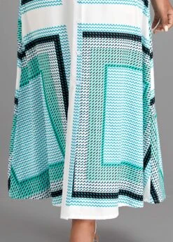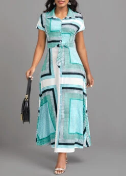 Cyan Button Geometric Print Belted Maxi Dress