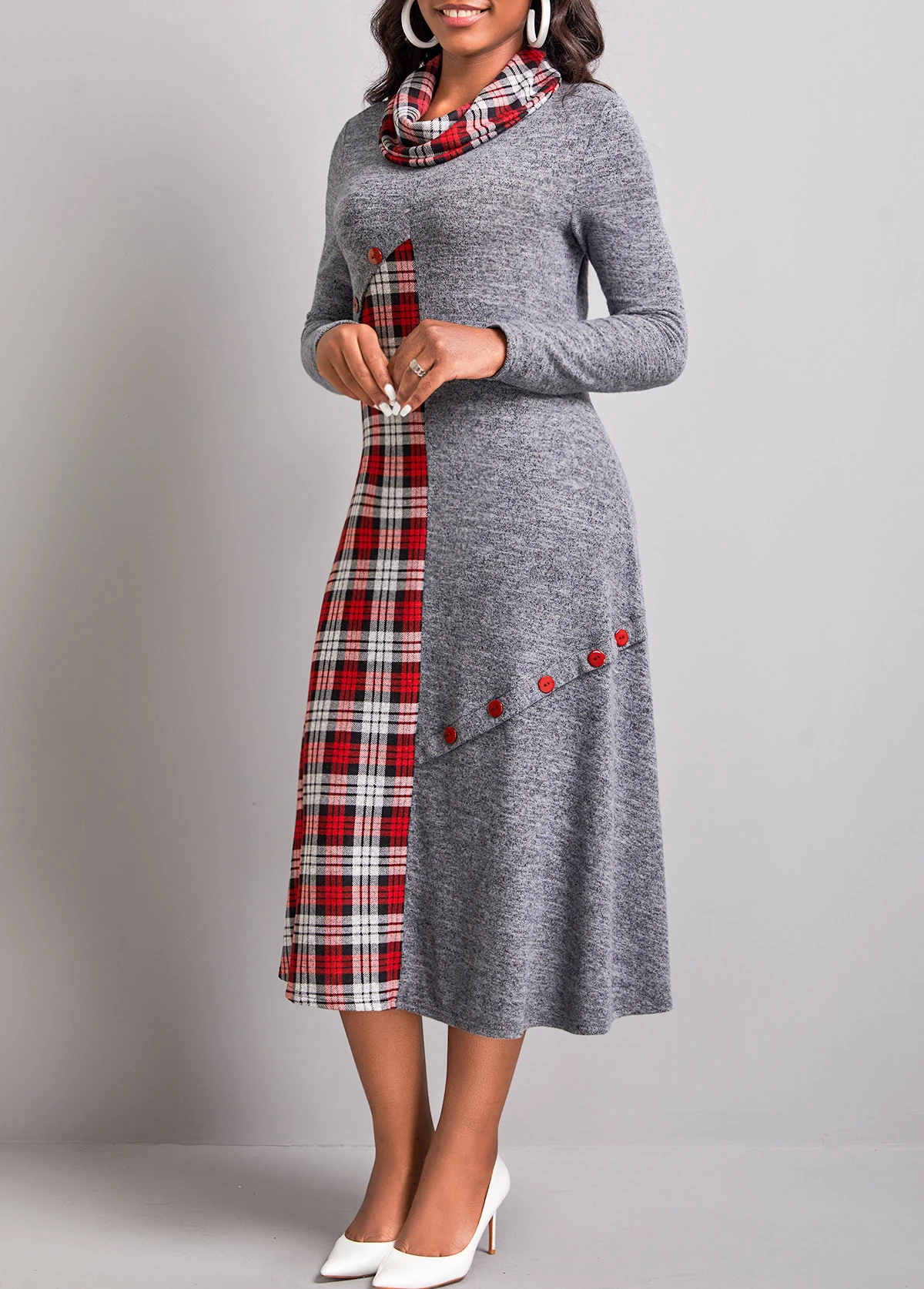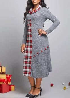 Dark Grey Button Tartan Print Dress