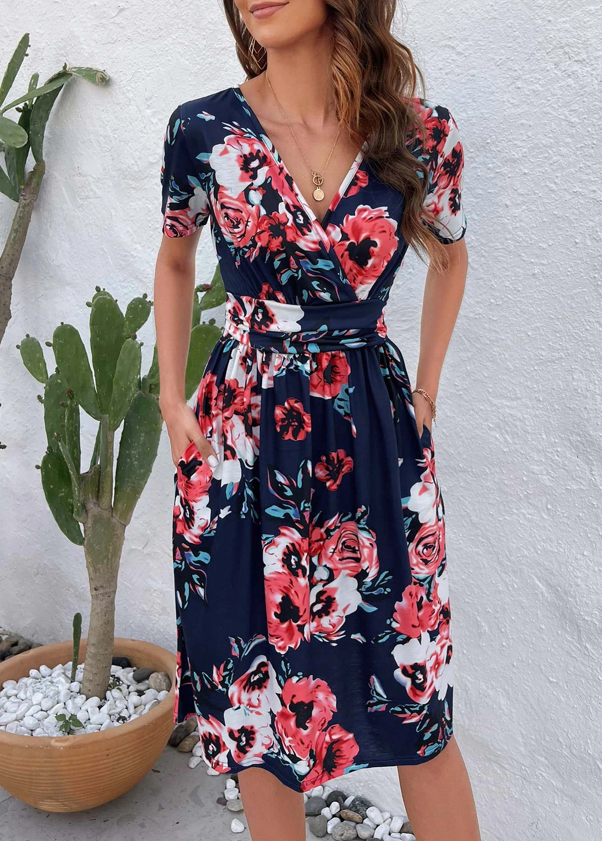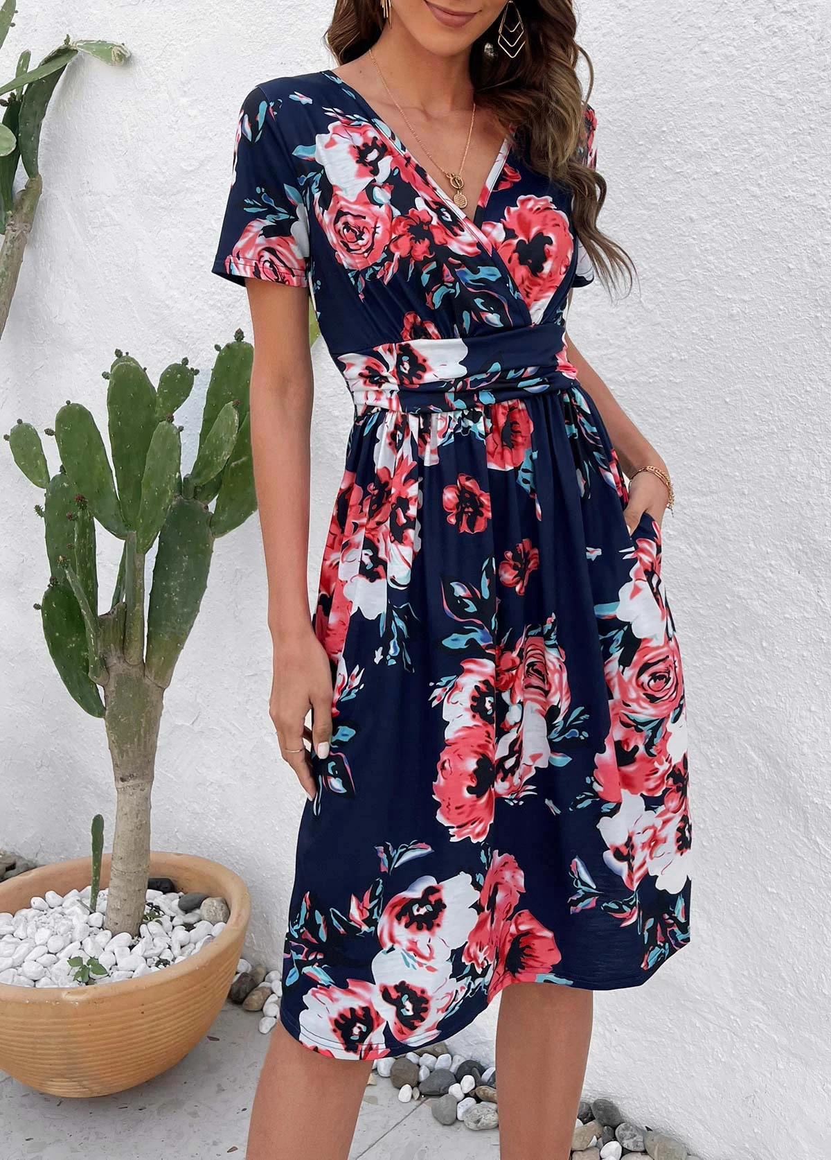 - Design Selling Point :Patchwork,Surplice,Umbrella Hem,Pocket