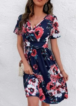 Navy Patchwork Floral Print Short Sleeve Dress