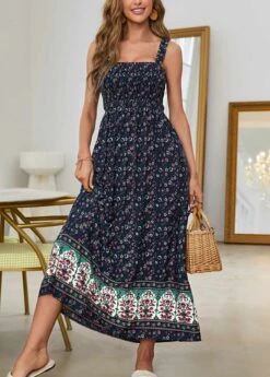 Navy Smocked Ditsy Floral Print Strappy Dress