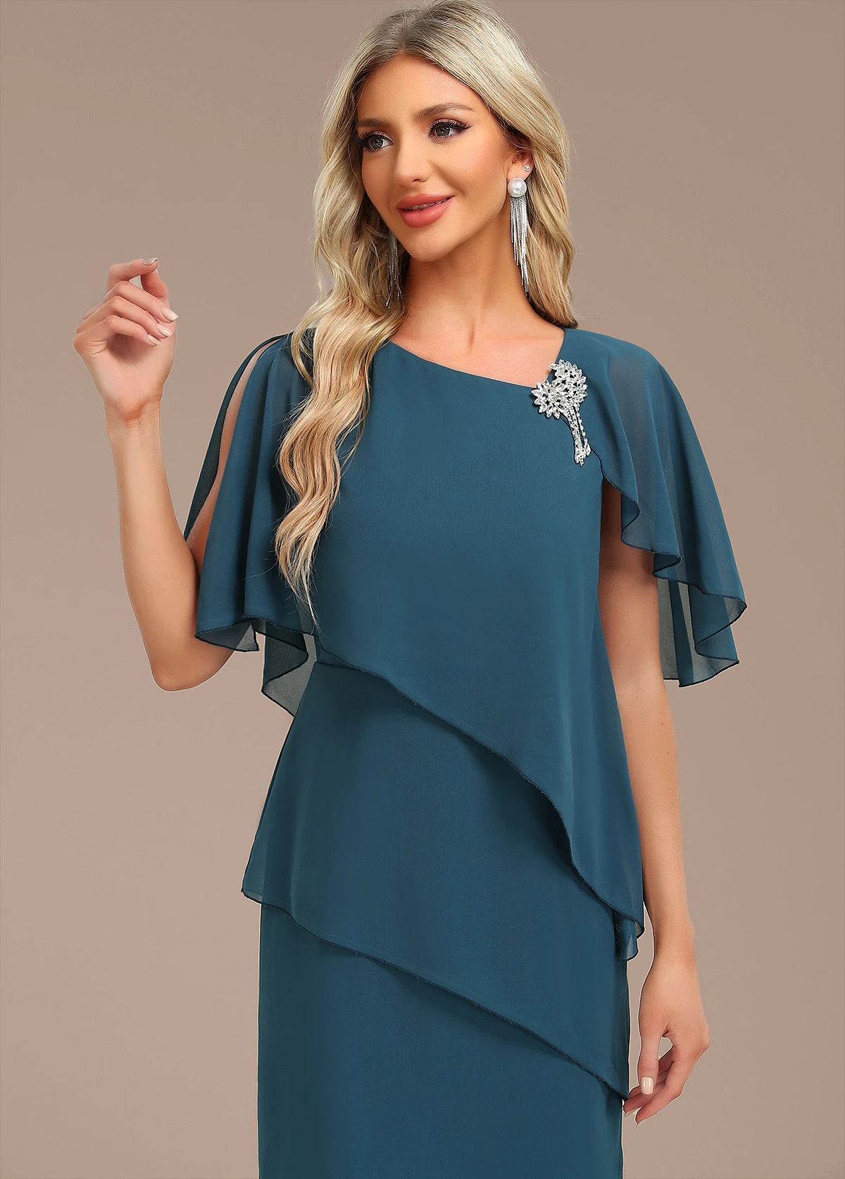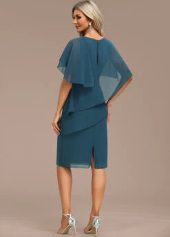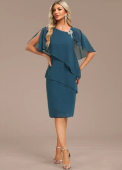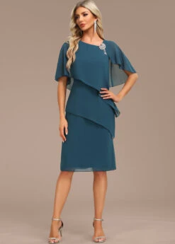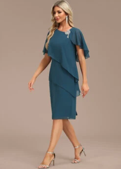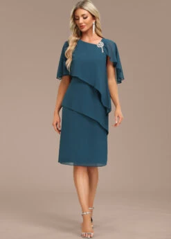 Peacock Blue Layered Cape Sleeve Asymmetrical Neck Shift Dress