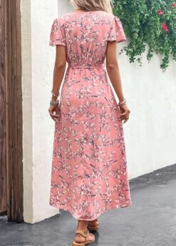 Pink Split Leaf Print Belted Maxi Dress