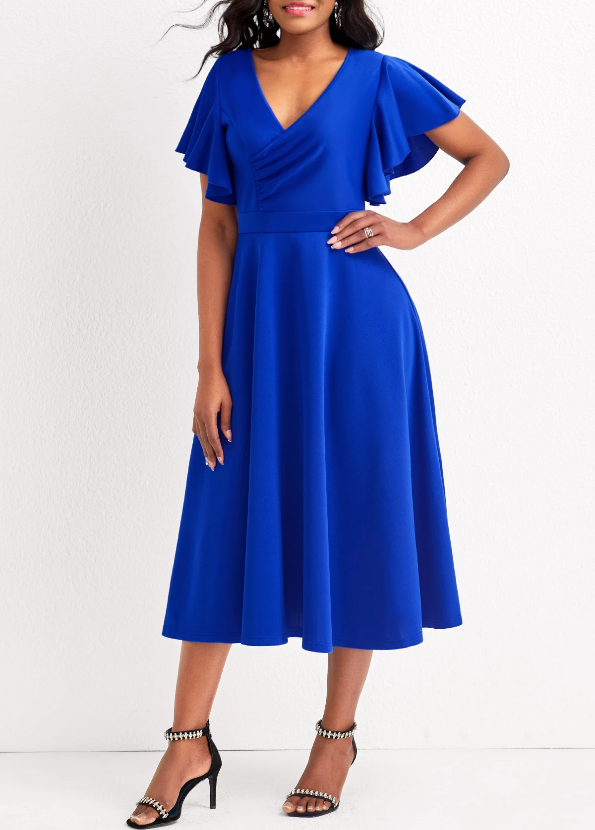Royal Blue Smocked Short Sleeve V Neck Dress