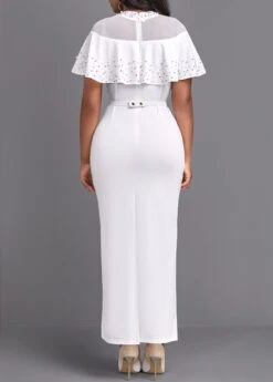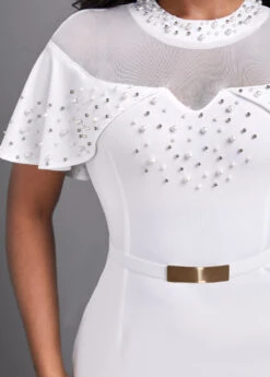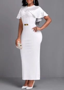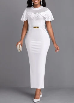 White Pearl Belted Short Sleeve Maxi Bodycon Dress